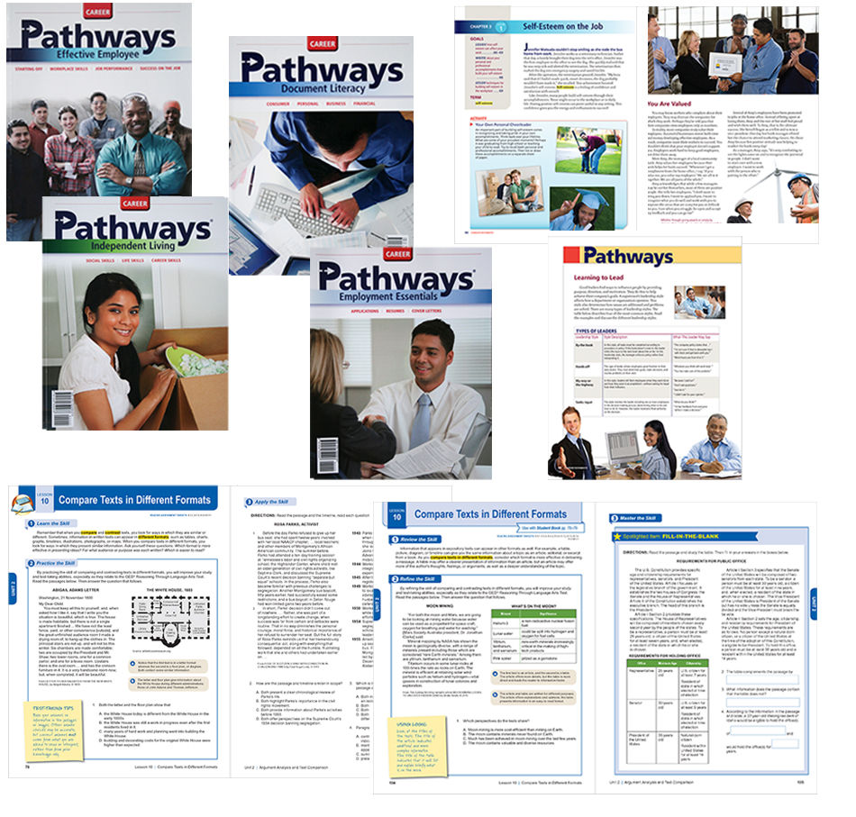 The Career Pathways series is used in work-readiness curriculums for at-risk learners, middle school through adult education. I worked with Paxen Learning editorial staff, along with designer and art director Jenifer Harrison, creating a common visual language throughout the series—from prototyping designs to final preparation of files for print—including photo research and editing, and creation of technical art. For the Steck-Vaughn Test Preparation for the 2014 GED© Test series, I worked in day to day collaboration with the editor on the Reasoning Through Language Arts Student Book and Workbook, developing content specific layouts within an InCopy workflow using existing templates, producing 596 total pages.